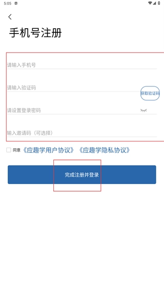 若需要进行注册操作,可进入手机号注册页面,依次填写手机号、验证码、密码等相关信息,勾选对应的协议后,点击【完成注册并登录】按钮即可。
