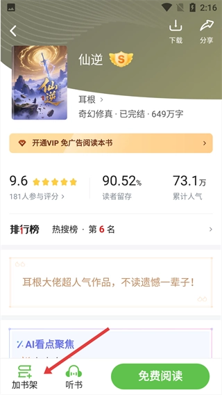 进入书籍详情页,点击【加书架】,收藏书籍。