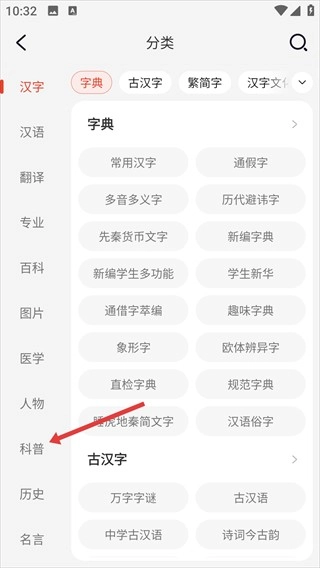 在分类页面的左侧选项中,找到【科普】分类并点击,即可切换至科普类内容的展示区域。