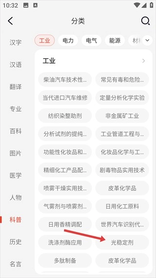 切换至科普分类后,选择【工业】分类板块,在该板块中查找【光稳定剂】相关条目,点击即可进入对应的内容页面。