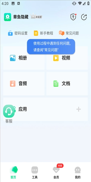 打开软件后会看到这样的界面,支持存储相册、视频、音频、文档等内容。