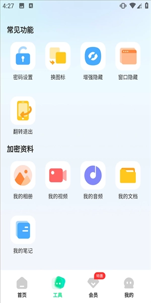 点击工具界面能看到常用功能、加密资料等选项,在这里可以对文件进行设置密码、更换图标等操作。