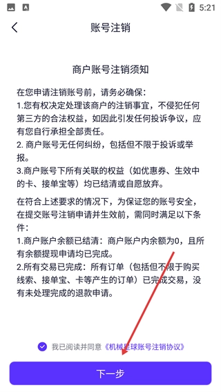 在账号注销页面,仔细阅读并勾选同意注销协议后,点击【下一步】按钮,接着按提示完成账号注销的后续步骤。