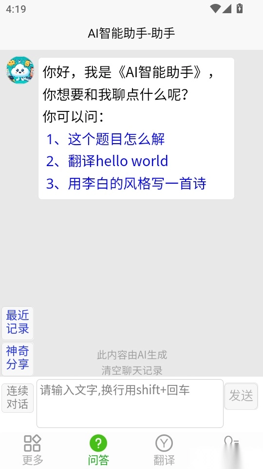 这是一款功能全面的AI智能软件,具备智能问答、互动聊天、文章生成等多种实用功能。