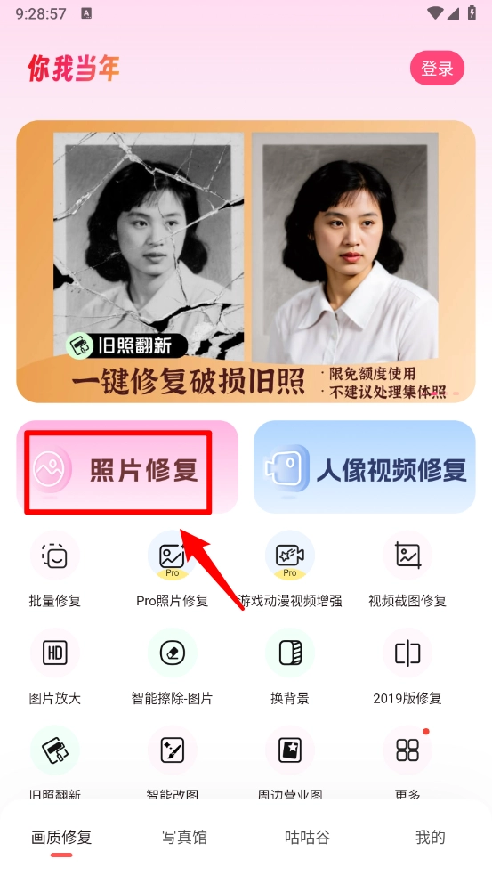 进入主页点击"照片修复",如图。