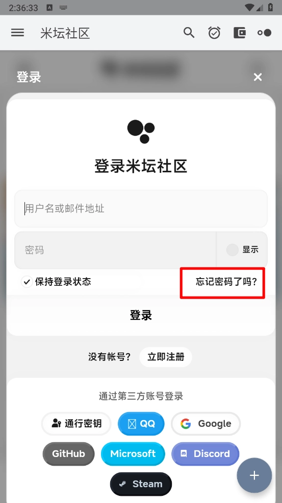 打开米坛社区,进入首页点击""登录。