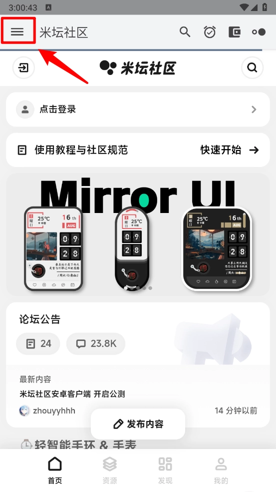 打开米坛社区,在首页点击左上角三条横线。