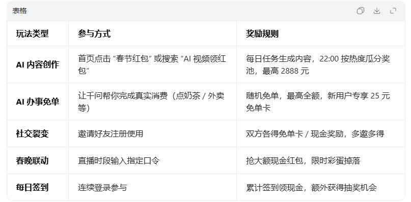 除夕彩蛋:2月16日与四大卫视春晚联动,发放大额红包(最高2888元)及限量AI眼镜