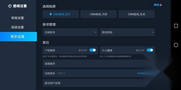 然后进入应用的设置页面(在首页点击“我的”,接着点击“设置”进入),在该页面中点击【更多设置】,选择对应的投屏设备,系统便会自动完成投屏操作。