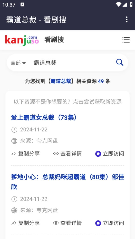 看剧搜是个专门的看剧平台,大家能在线观看自己喜欢的影视内容,也能通过关键词精准搜索,还可以把影视下载下来。这样用户就不用再受剧荒的困扰,随时都能看到想看的影片。平台集数齐全,你想看的剧集基本都能在这里找到。