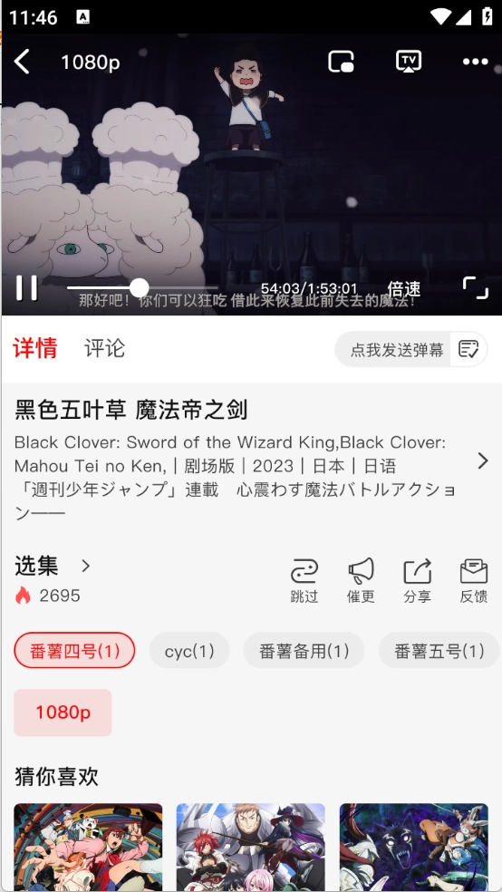 用户选好动漫打开后,选定要观看的集数;要是播放时遇到卡顿,或者发现集数不完整,还可以切换播放源继续观看。