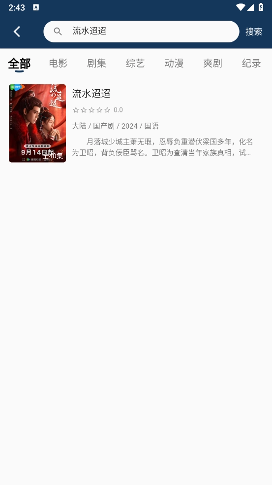浏览或搜索到想看的影视剧集后打开即可,就像小编打开的是《流水迢迢》一样。