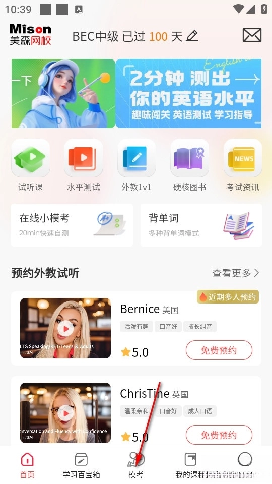 点击软件进入首页,在下方找到模考。
