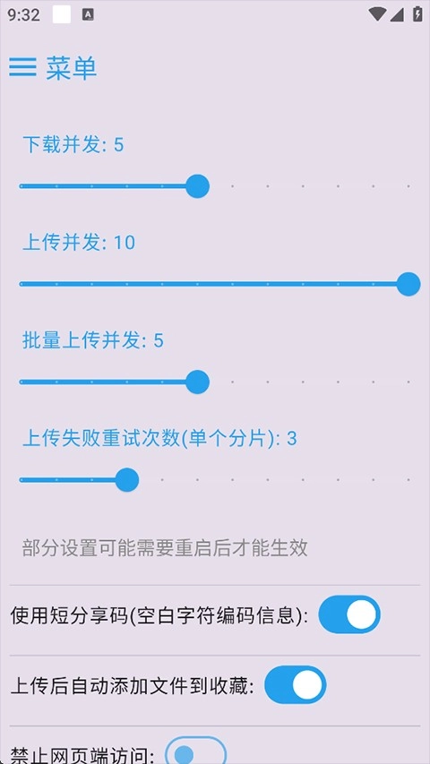 答:进入页面后,点击右上角的“菜单”选项,接着选择“设置”,就能对上传并发数量等功能进行调整了。