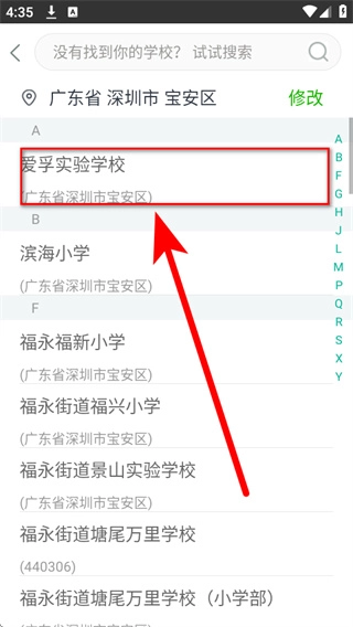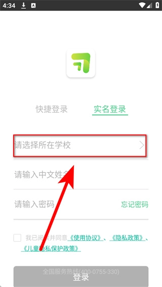 在实名登录页面点击“请选择所在学校”栏,即可进入学校选择界面。
