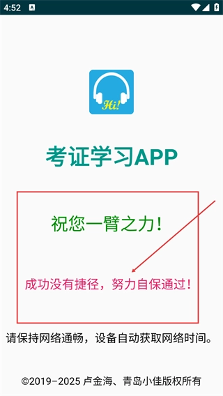 进入考证学习的启动页面,这里会显示“祝您一臂之力!”的提示语,等完成启动流程后,就能进入应用的主界面了。