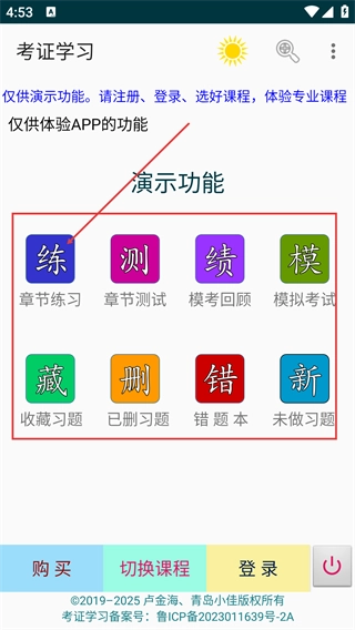 进入应用主界面后,界面的“演示功能”区域设有“章节练习”“章节测试”“模考回顾”“错题本”等核心学习功能按钮。