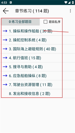 进入章节练习页面后,既可以选择“练习全部题目(共114题)”,也能够勾选“题目乱序”选项来调整做题的顺序。