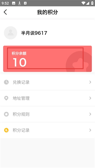 在【我的积分】页面,你可以查看【积分余额-10】,同时也能看到【兑换记录】【积分规则】等相关内容。