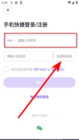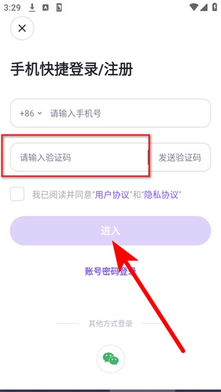 把收到的短信验证码输入到验证码栏,勾选对应的协议后,点击进入按钮,就能完成登录操作。