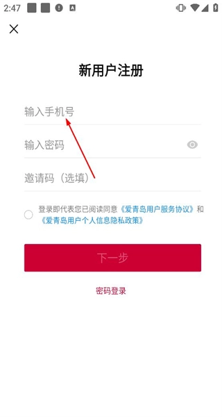 在新用户注册页面,需按顺序填写手机号、设置密码,勾选相关协议后点击“下一步”按钮,即可完成账号注册流程。
