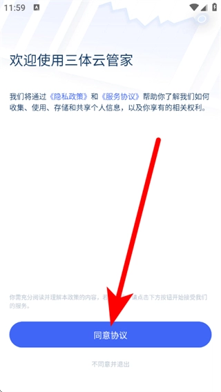 打开三体云管家,在欢迎页面点击同意协议,随后进入登录选择页面。