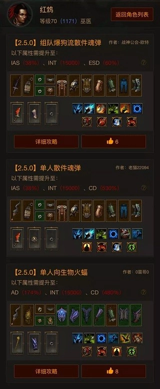 切换到巫医角色后你会发现,提升神器里已经备好了当前最热门的几套BD指南,像大隐藏的组队爆狗魂弹、单人散件魂弹、生物火蝠等都包含在内。点击配装指南里的装备或技能图标,就能查看装备详情以及技能/符文的具体描述,要是点击“详细攻略”按钮,还能阅读由凯恩高端玩家编写的BD详细内容和打法教学呢!