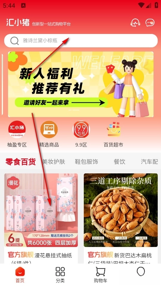 打开软件进入首页后,你可以通过上方的搜索栏搜索想要的商品,也能在页面下方查找所需的商品。
