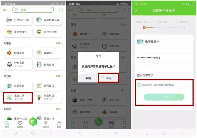 在首页的社保模块里找到“家庭共济”图标并点击,接着按照提示确认开通电子社保卡,再依据后续步骤完成操作,就能成功领取您个人的电子社保卡了。