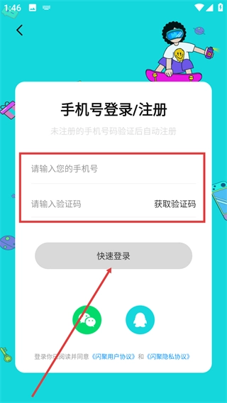 在【手机号登录/注册】页面,输入手机号并点击【获取验证码】按钮,待收到验证码后将其填写进去,随后点击【快速登录】按钮,就能完成账号验证流程。