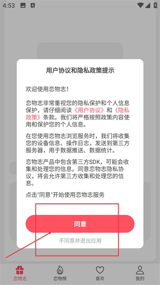 在仔细阅读《用户协议》和《隐私政策》的条款内容后,点击【同意】按钮,就能进入恋物志应用的主界面,进而使用该应用提供的各项服务。
