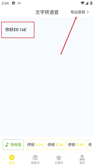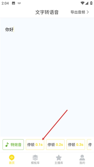 在输入框里输入文字(比如“你好”)之后,点击底部的【停顿0.1s】按钮,就能把对应的停顿指令插入到文本当中。