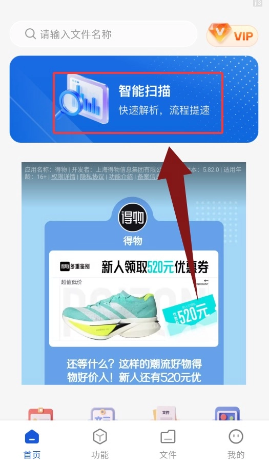 首页配备了“智能扫描”功能的入口,点击该入口就能开启扫描流程。