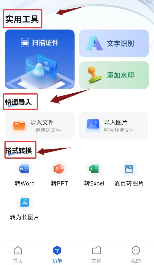 功能界面配备了实用工具、快速导入以及格式转换等辅助类功能。