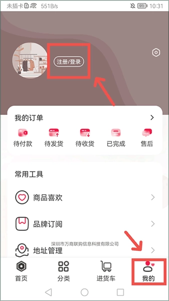 打开万商联购的主页后,找到页面右下角的“我的”按钮并点击,接着点击“注册/登录”选项。