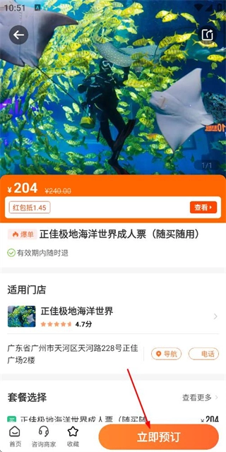 在商品详情页点击“立即预订”按钮,即可进入该门票的预订流程。