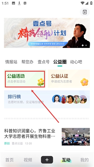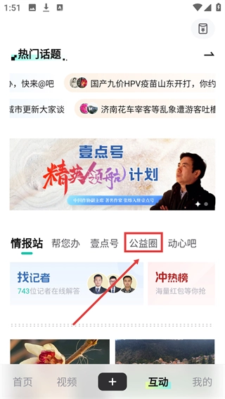 在互动页面里,找到【公益圈】这个选项并点击它,进入之后就能查看和公益相关的板块了。