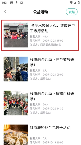 在【公益活动】页面,能够查看具体活动的详细信息,例如【冬至水饺暖人心,致敬环卫工志愿活动】的举办时间和发起单位。