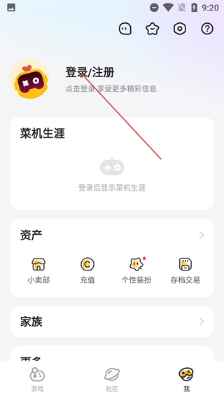 进入后点击【登录/注册】区域,即可启动登录流程,完成登录后就能查看【菜机生涯】【资产】等功能模块。