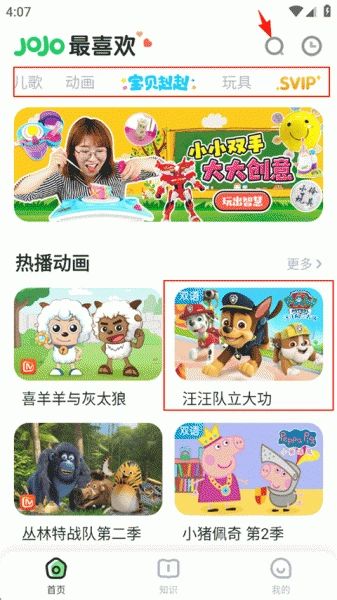 打开超级宝贝JoJo后,知识页面涵盖了语文、英语、幼儿园、社会等多个知识大板块,同时还包含儿歌、童话寓言、侦探推理等各类小故事。