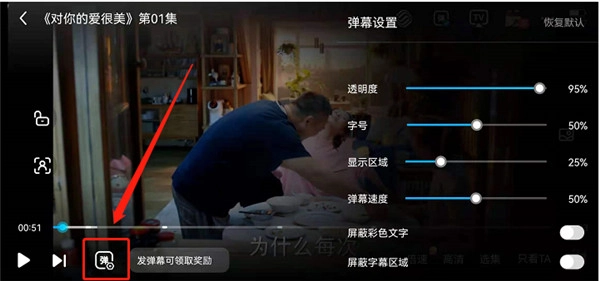 4、如果大家想看弹幕又嫌内容太多的话,可以点击下图框中位置进行调整弹幕的显示区域、字号、速度等。