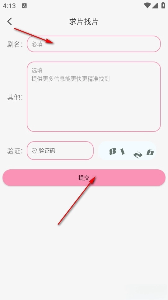 然后我们在求片找片板块填写剧名,做好相关描述,输入验证码后提交。