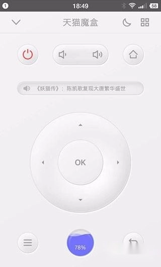 安装完成后,重新用手机连接阿里云盒子,此时就能顺利连上了。进入界面后能看到不少功能,要是需要用遥控,点击底部中间的蓝色按钮,就能进入遥控器界面。关于遥控器的使用