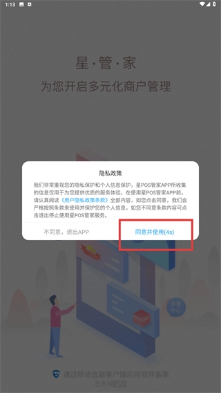 在星管家的隐私政策弹窗中,待倒计时结束后点击【同意并使用】按钮,确认该协议即可进入应用。