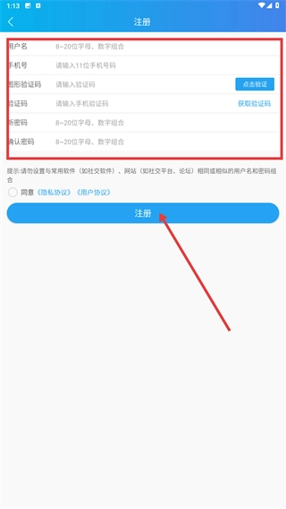 新用户进入注册页面后,需按顺序填写用户名、手机号,完成图形验证和手机验证,设置并确认密码,勾选相关协议后点击【注册】按钮,即可完成账号的创建。