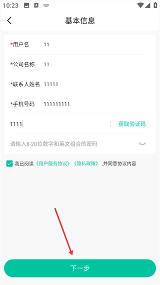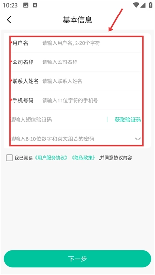 进入基本信息页面后,填写用户名、验证码、密码以及公司名称等相关信息。