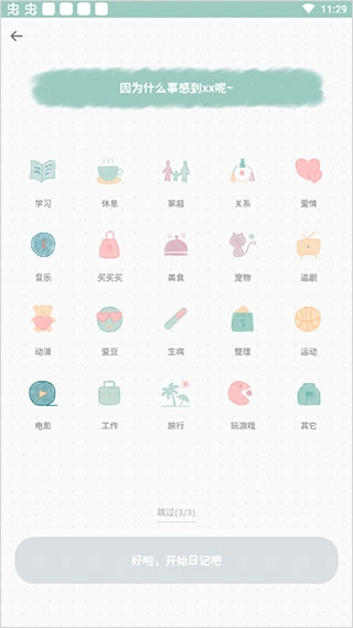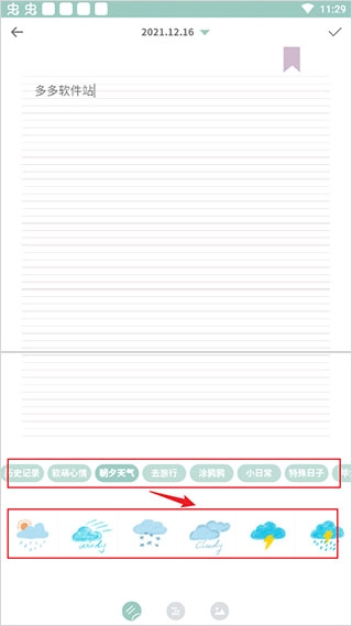 然后就可以开始填写了,还能借助下方的便签来记录当时心情的贴纸。