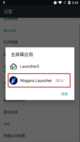 除此之外,在系统设置的“主屏幕应用”选项里,我们得把它切换成“niagara launcher”。