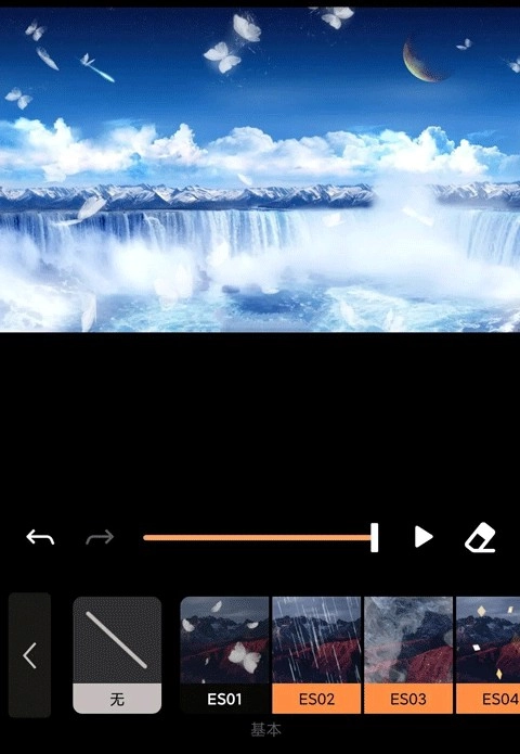 接着点击“覆层”选项,挑选图里展示的“ES09”效果——这个效果是添加飞舞的蝴蝶,要是你想换其他特效也可以,之后点击右上角的“导出”按钮就完成了。