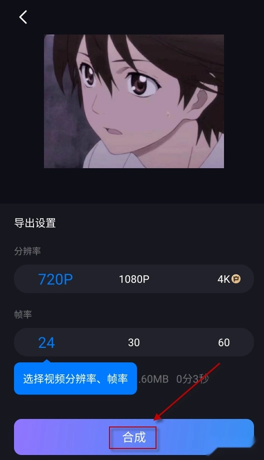 完成后点击右上角的“下一步”按钮,之后设置视频的分辨率与帧率,再点击“合成”按钮就可以了。